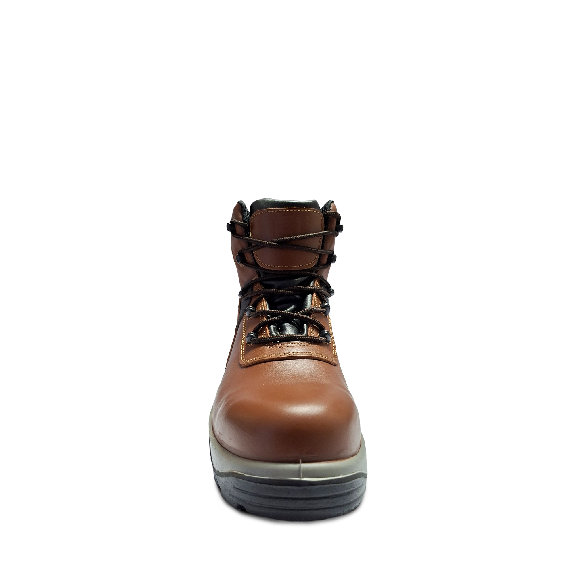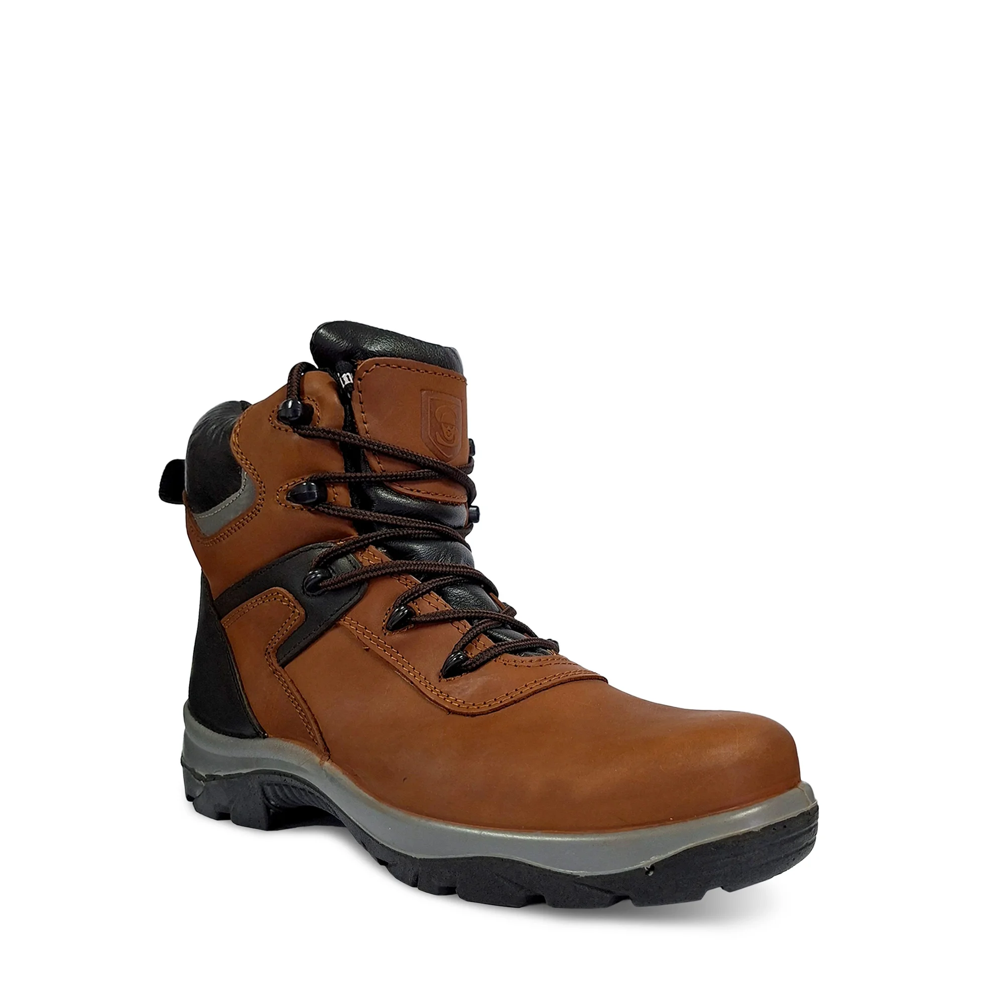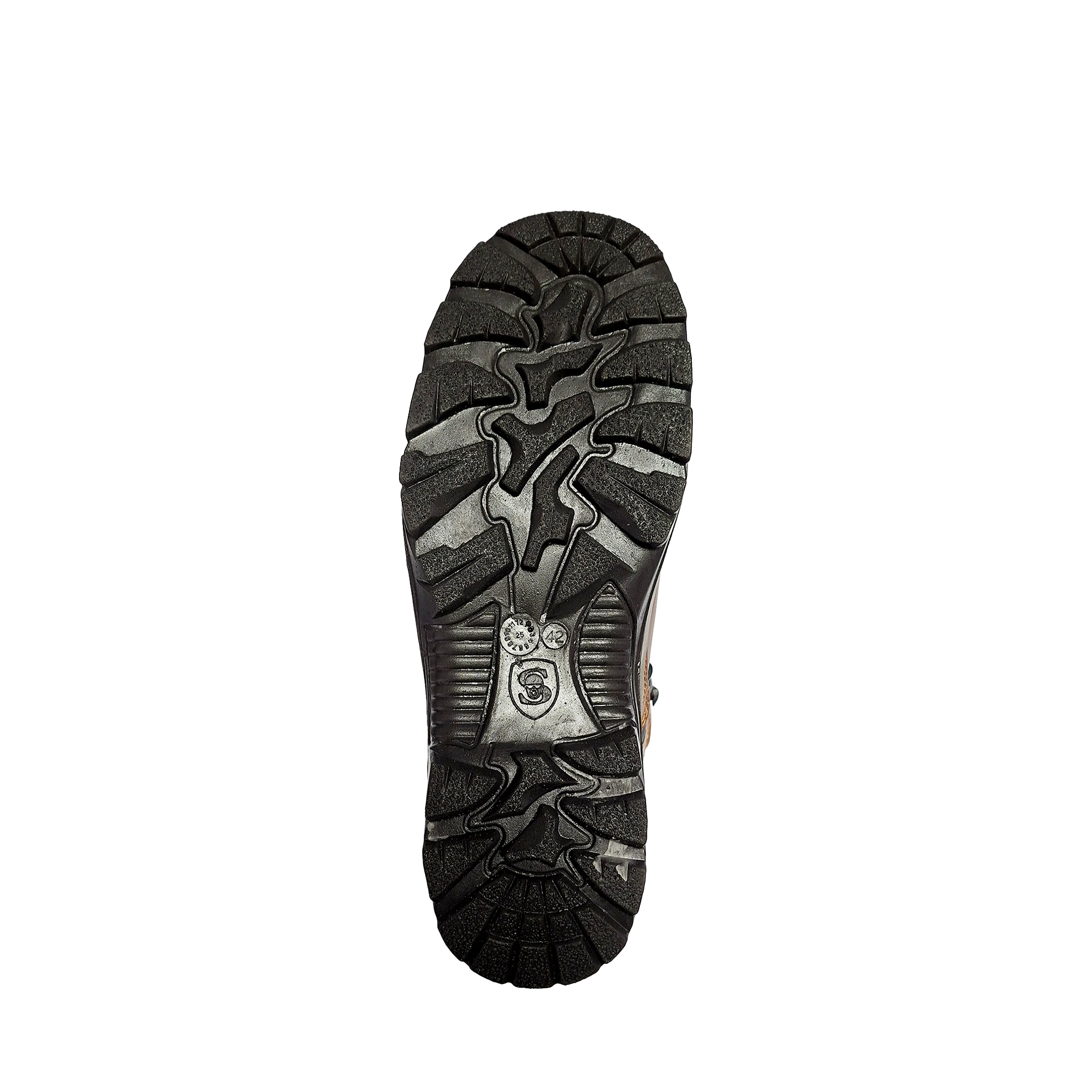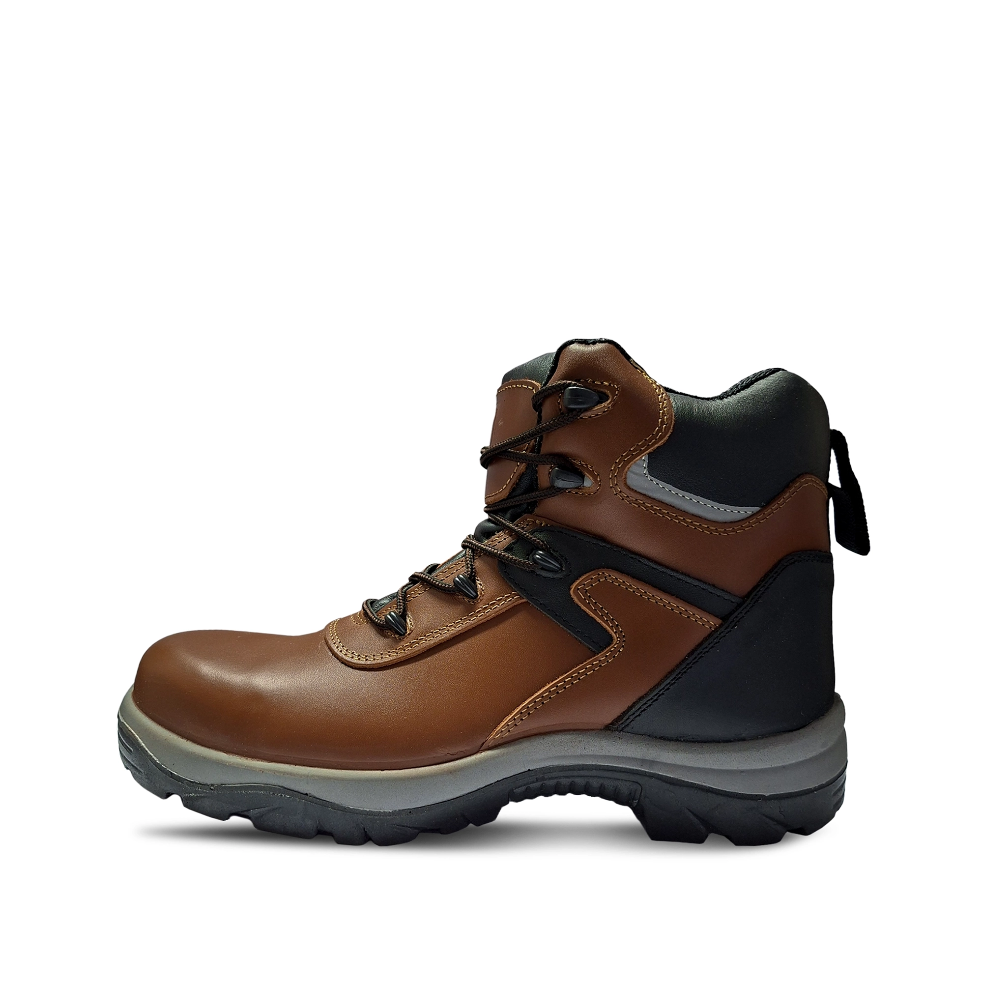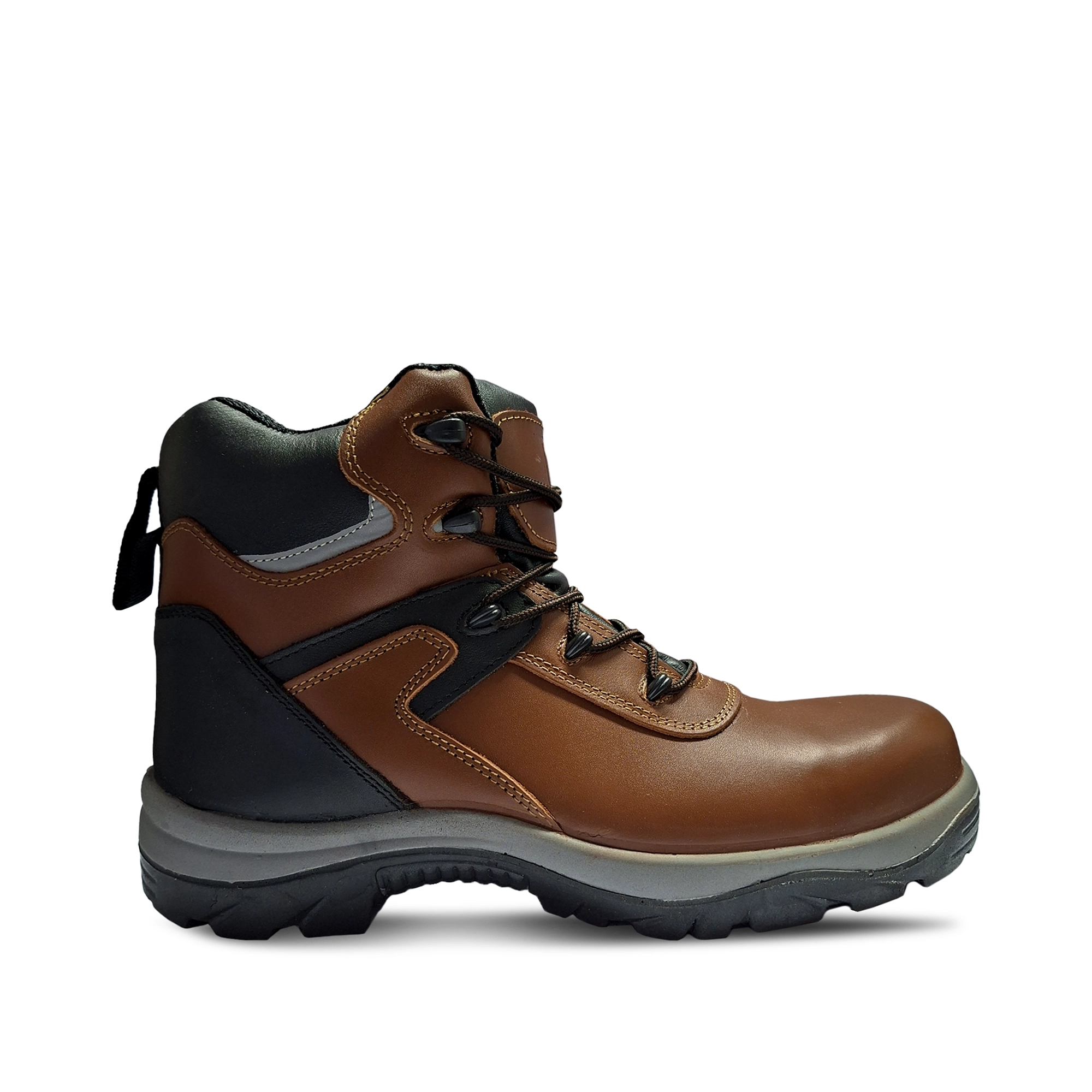 Botín Sierra de cuero vacuno, con interior de tela mesh antibacterial, acolchado ergonómico de espuma y badana. Incorpora suela de poliuretano bidensidad, plantilla removible de EVA para mayor confort, puntera plástica y plantilla anticlavos no metálica. Cuenta con ganchos y pasantes plásticos con pasadores de poliéster para un ajuste seguro, además de un refuerzo interno entre el cuero y el forro que une la lengüeta a la bota, previniendo desgarros.