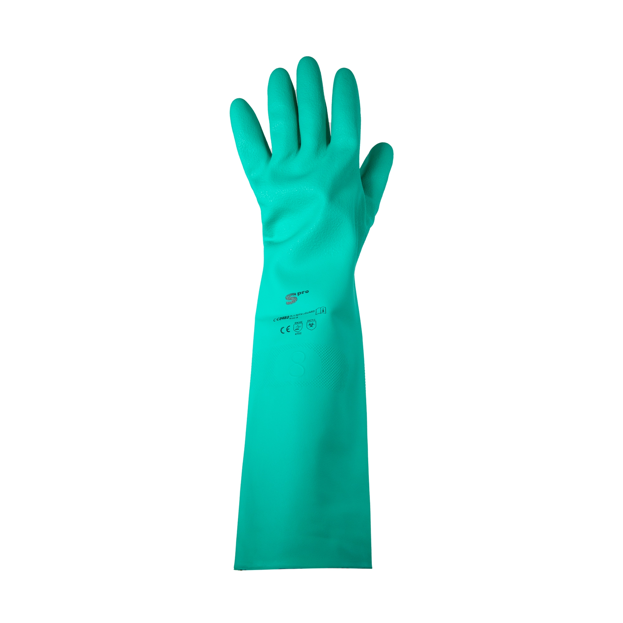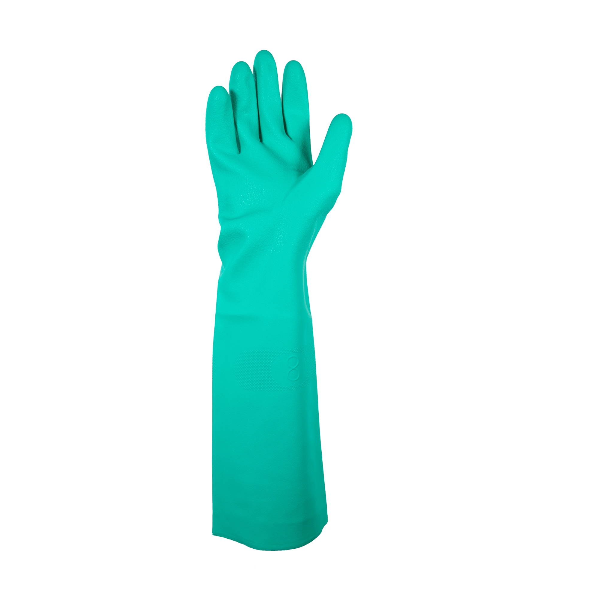 Guante de nitrilo con resistencia óptima a excelente destreza, gracias al ajuste ergonómico especial para manipular productos químicos, en actividades de agroindustrias, mantenimiento, fumigación y construcción.