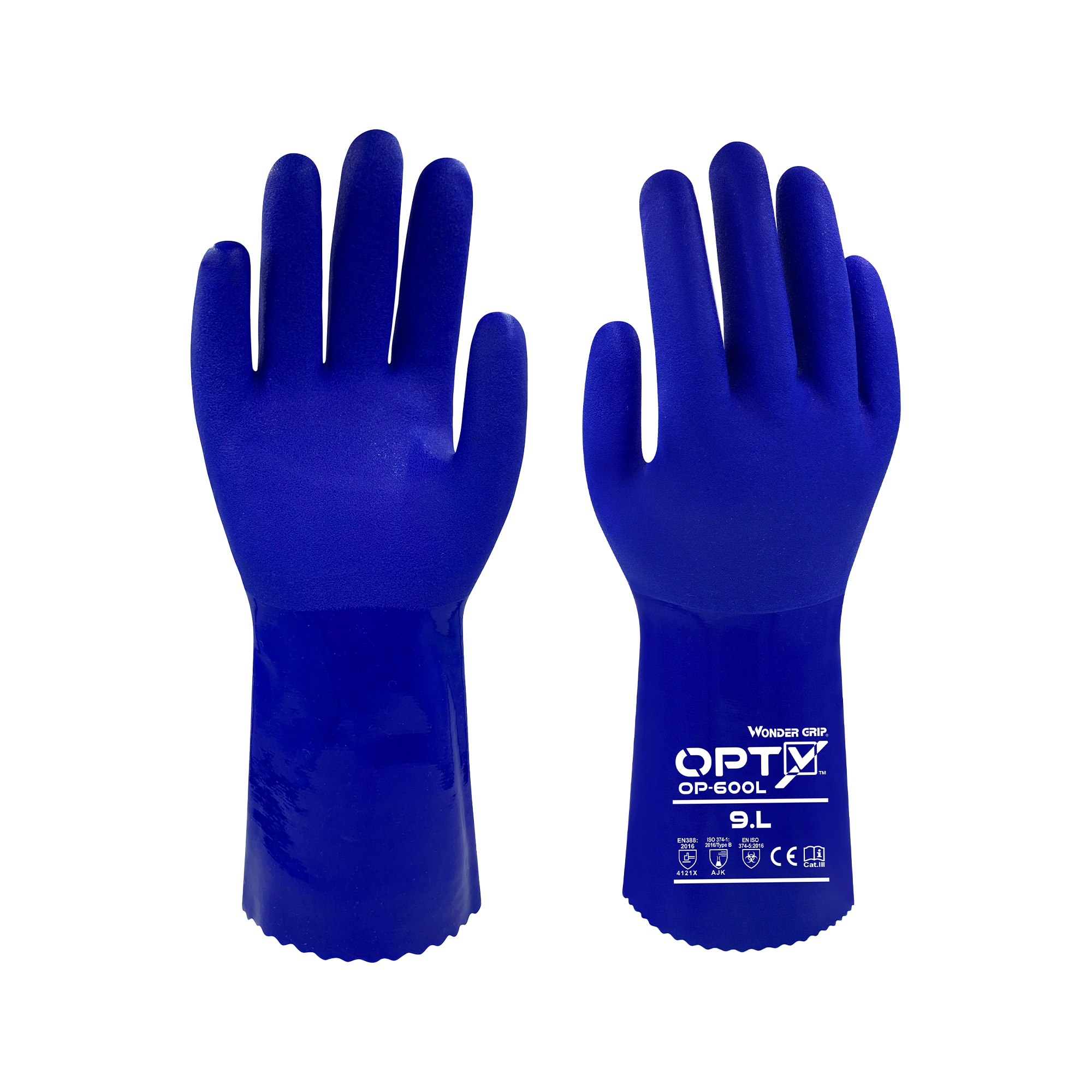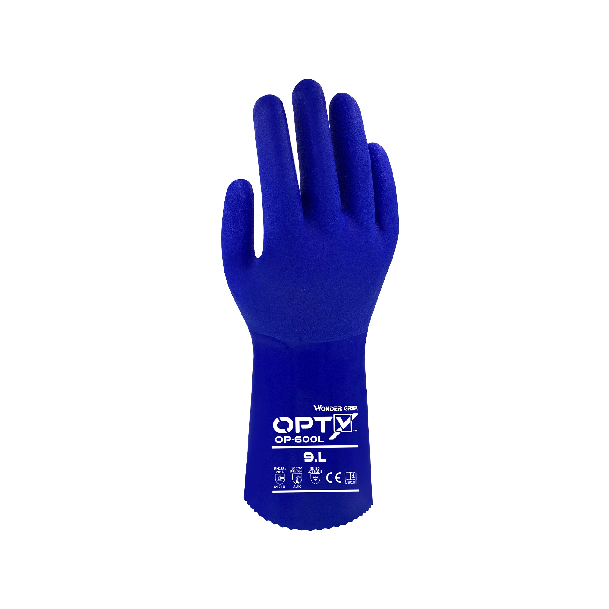 El innovador modelo OP-600L OPTY™ ofrece protección contra riesgos químicos en ambientes secos, aceitosos o húmedos. Gracias al acabado moldeado duradero en la palma, la fuerza de agarre es excelente en todo tipo de entornos. El triple revestimiento de PVC garantiza una excelente resistencia al aceite. El forro de algodón sin costuras ofrece una destreza incomparable. La longitud del guante de 30 cm protege completamente las manos de los usuarios. EN 374-1: AJK/A = Metanol/J = n-Heptano/K= Hidróxido de sodio 40%.