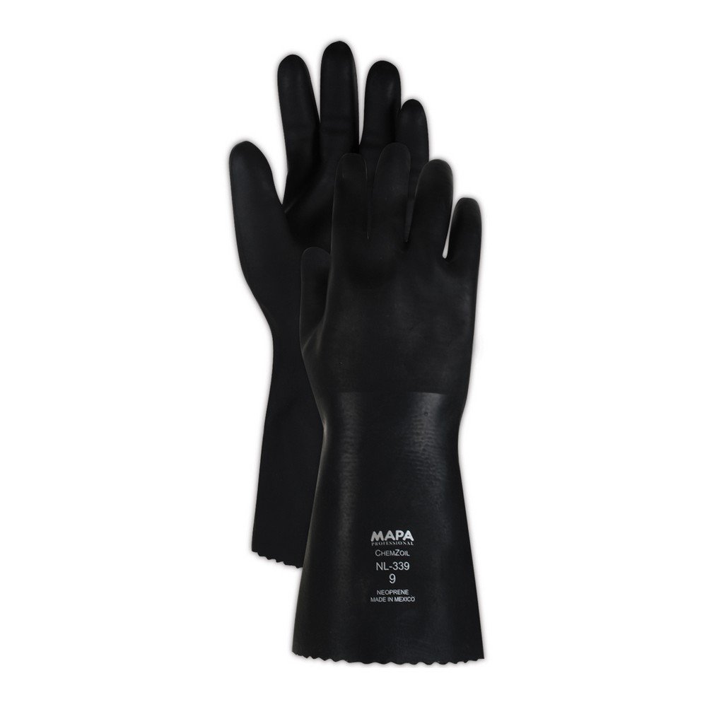 Diseñado utilizando una forma exclusiva anatómica, los guantes ChemZoil ofrecen un ajuste excelente y una comodidad excepcional, incluso cuando se utilizan en periodos largos. Los dedos precurvados ofrecen una libertad de movimiento sin rival; además ofrece aislamiento térmico del tejido de algodón para manipular líquidos calientes, y excelente resistencia mecánica y vida más larga de servicio, gracias al soporte textil y el grosor del guante. Superior resistencia química contra ácidos y bases como el ácido fluorhídrico concentrado, aceites y grasas, debido a su construcción de neopreno multicapa 100%.